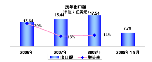 2006—2009年中國健身器材出口額 單位:億美元